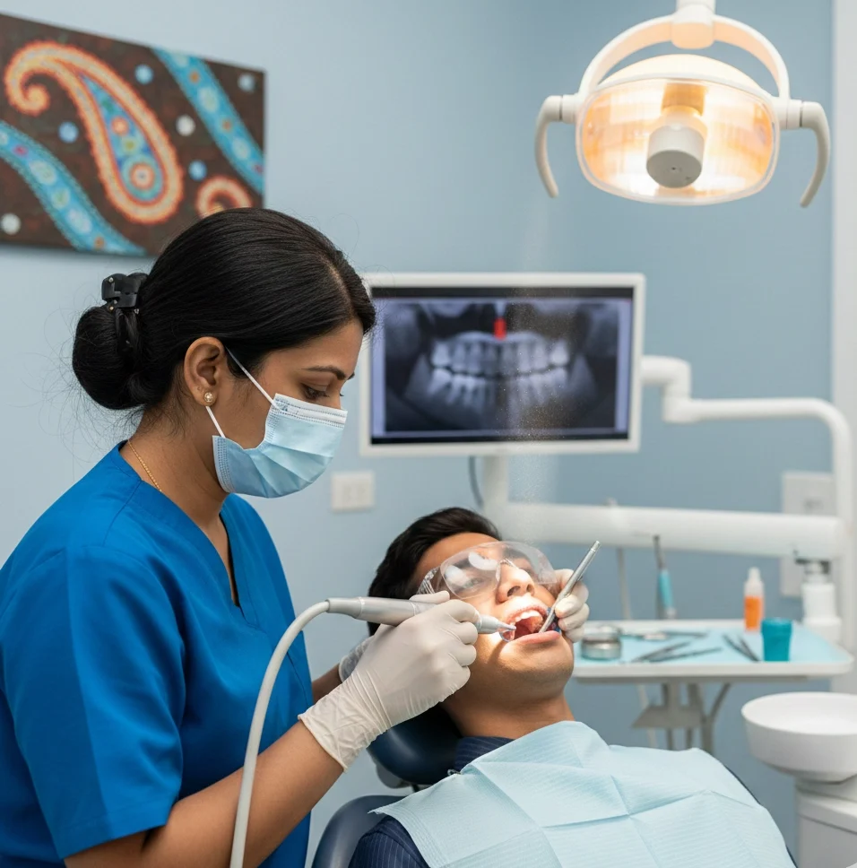 Using an ultrasonic scaler, we gently remove plaque and tartar from your teeth surfaces and along the gumline. The device uses mild vibrations and water spray to clean efficiently - no drilling, no pain.